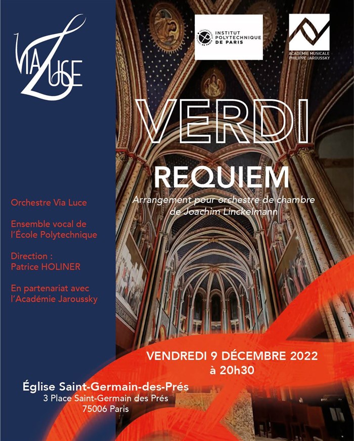 L'Ensemble vocal de l'Ecole Polytechnique et l'Orchestre Via Luce se retrouvent une nouvelle autour d'une oeuvre musicale grandiose et iconique, le Requiem de Verdi dans sa version de chambre arrangée par Joachim Linckelmann.