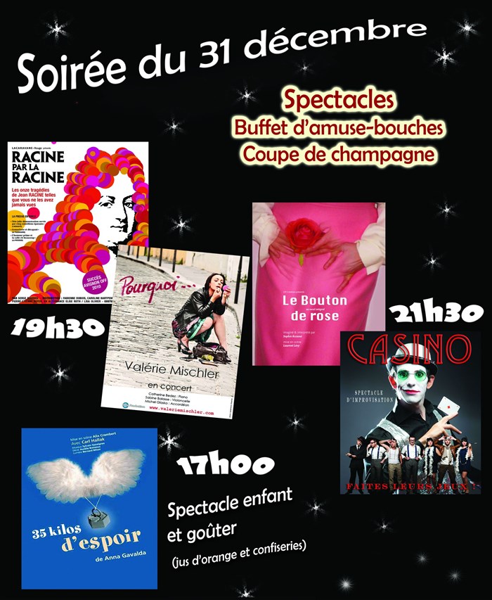 Pour réserver 1 spectacle + buffet d'amuse-bouches et coupe de champagne, reportez vous à la page de chacun des spectacles, et cliquez sur le 31 décembre.