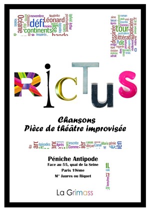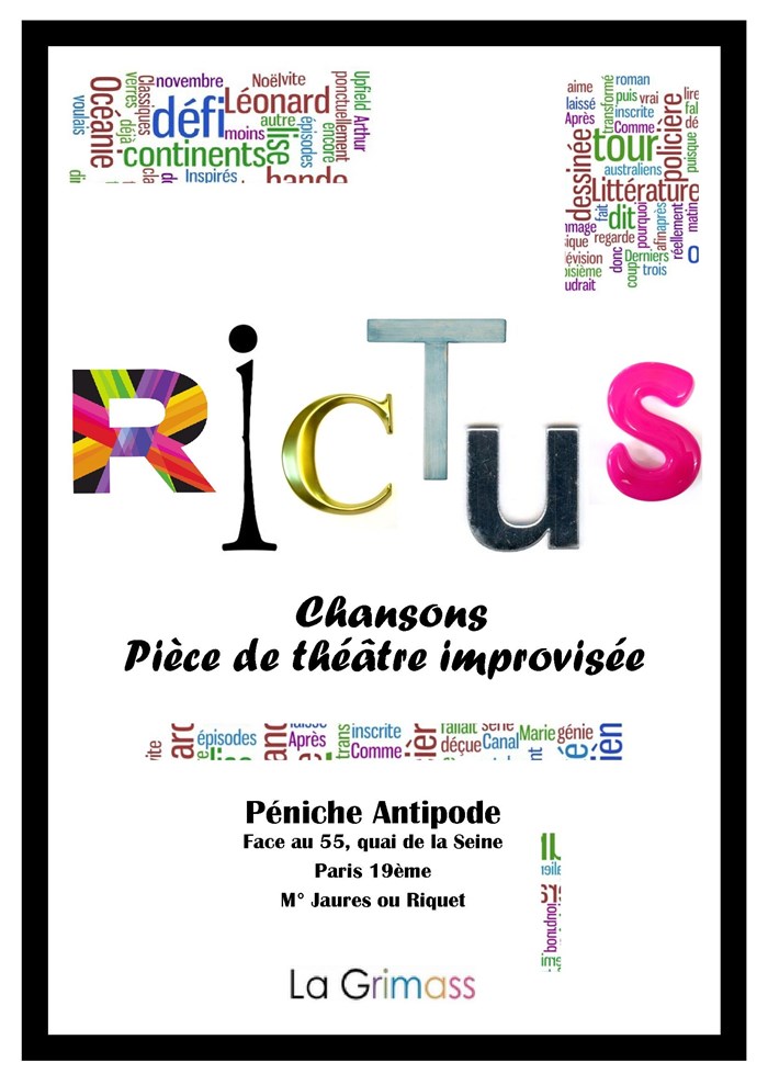 "Rictus, est un nouveau spectacle original d'improvisation des productions Grimass. Grâce au public, Rictus improvise une pièce de théâtre d'une heure, mélangeant comédie, musique, chansons et surprises ! "