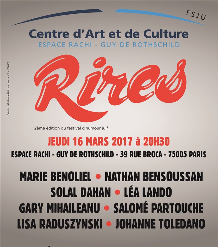 Le 16 Mars 2017, Talent Show Productions s'associe au Centre d'Art et de Culture – Espace Rachi – Guy de Rothschild et créé " Rires ". Cet évènement s'inscrit dans le cadre de la deuxième édition du Festival de l'Humour Juif. Son ambition ? Réunir la nouvelle génération du rire le temps d'une soirée. Tous se succèderont pour jouer un extrait de leur spectacle et défendre leur one man show, actuellement à l'affiche ou à venir. " Rires ", animée par Lisa Raduszynski et Jibé Mazoyer,promet de bonnes rigolades en perspective !