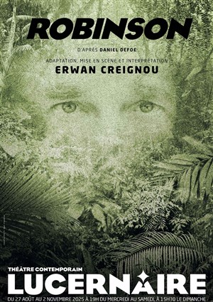 du Lundi à Vendredi!Erwan Creignou qui a tout assumé seul sur son île avec grand talent(adaptation, mise en scène et interprétation) , nous captive du début à la fin.Comédien dont j'ai pu déjà apprécier le talent dans des pièces différentes,Erwan Creignou est un Robinson profondément humain .Un seul en scène à deux têtes(Will) et la voix paternelle qui résonne"je suis ton père" pour Defoe.J'ai beaucoup aimé ce seul en scène!