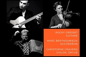 Ce soir c'est l'exceptionnelle réunion de 3 grands solistes dont la réputation n'est plus à faire: Rocky Gresset à la guitare, Marc Berthoumieux à l'accordéon, et Christophe Cravero au violon et à l'orgue.