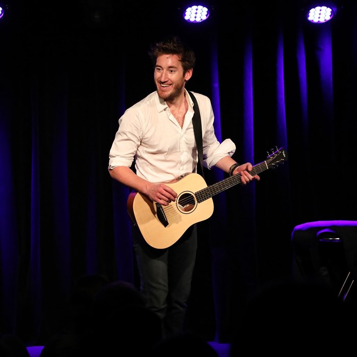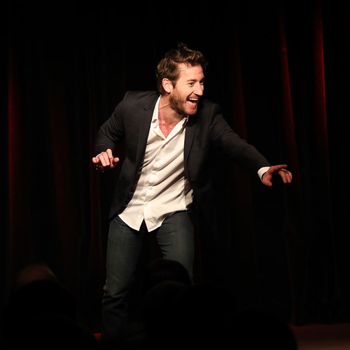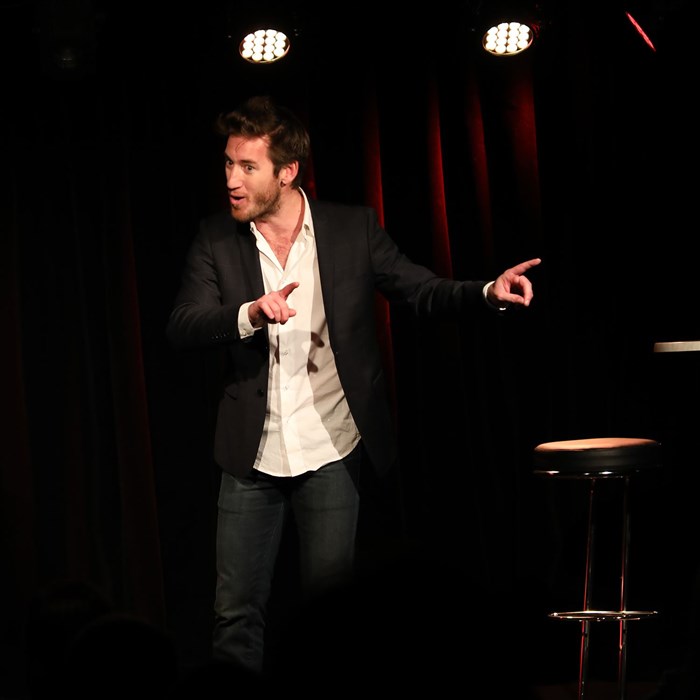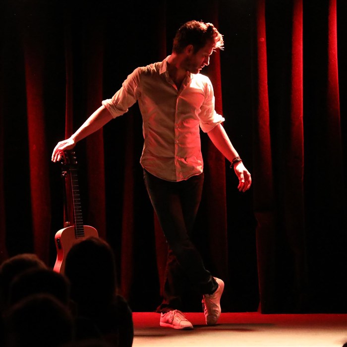 Son spectacle est un one-man-show qui mêle à la fois des personnages (le commercial, le musicien,...) et ses propres expériences.