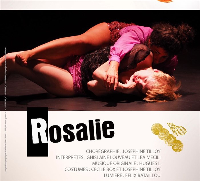 Rosalie est une pièce qui interroge nos rapports aux normes et critères esthétiques à travers deux corps féminins. Dans un espace fictionnel et à partir d'un corps contraint, les interprètes s'approprient et étirent des codes de séduction par le biais des danses d'hier et d'aujourd'hui. "Et les damoiselles avec une contenance humble, les yeulx baissez, regardant quelquesfois les assistans avec une pudeur virginale" Orchesographie, Thoineau Arbeau Entre relâchement et contraction du bassin, ces femmes grimaçantes proposent une superposition de mouvement. Chacune à leur manière, elles utilisent l'énergie émanant des différentes temporalités au sein de leur propre corps afin de pousser leur personnage à l'extrême. "J'apparaissais nue mais je dénonçais la gestuelle stéréotypée de la séduction féminine tels les déhanchements, la bouche en avant, les jeux avec les cheveux. Je créais des attitudes rebelles, inventives, expressives" Paris Match, Orlan.