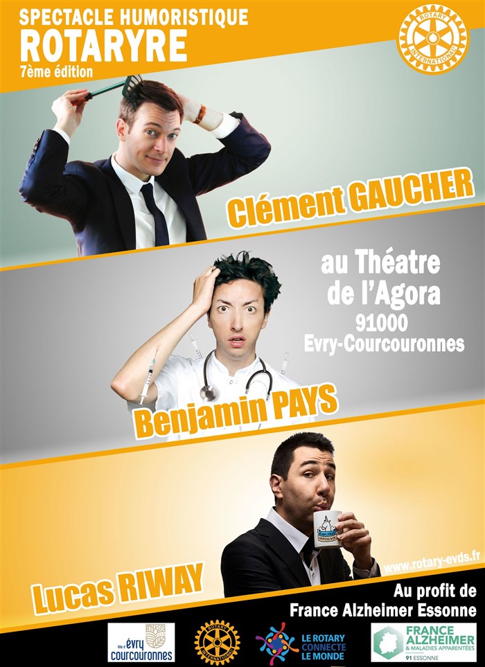 3 humoristes vous ferons rire pendant 1h30 ! 100% des recettes du "Rotaryre 2020" sont au profit de France Alzheimer Essonne.