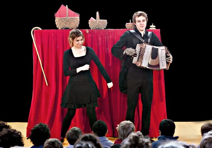 Tandis que cette dernière [marjolaine Juste] manipule les marionnettes et prête sa voix au récit, son frère Benoît, en queue de pie noire, l'illustre musicalement [...] tout en se glissant dans la peau du loup ou de la vieille dame. Un parti pris intéressant.