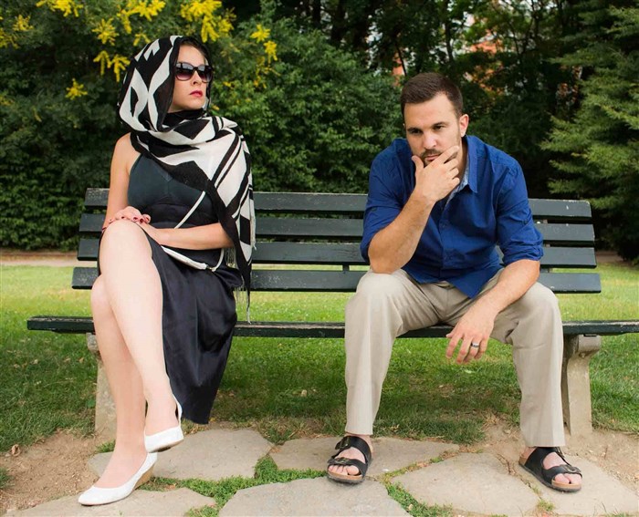 Sur le banc une femme, la trentaine. Posée à côté d'elle, une serviette gonflée par un manuscrit. Une voiture dépose un homme avec sa valise.