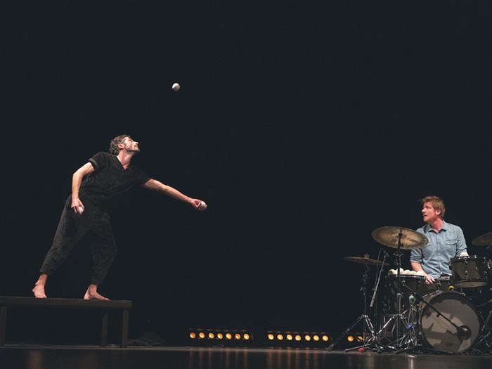 Entre Pierre, le batteur, et Julien qui danse avec les objets, l'entente est parfaite, l'écoute est palpable, le murmure sous-jacent. Le dialogue qui naît n'a pas besoin des mots pour surgir ; il s'appuie sur la musicalité de l'un à l'autre. Glissements, frottements, phrasés, accélérations, ruptures... Les balles sont du même cuir que la peau des tambours, tandis que les longs bâtons en équilibre sur les doigts du jongleur rappellent les baguettes du musicien.