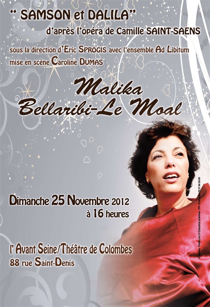 Samson et Dalila d'après l'opéra de Camille Saint-Saens, un spectacle proposé par Voix en Développement, dans le cadre de l'opération "Une diva dans les quartiers" mené par la mezzo-soprano Malika Bellaribi-le Moal, avec la participation de ses ateliers lyriques du Centre Social et Culturel des Fossés-Jean de Colombes, du Centre Social Petits Près Sablières de Créteil et de l'Opéra Dévoilé de Paris, sous la direction du chef d'orchestre Eric Sprogis avec l'ensemble orchestral Ad Libitum.