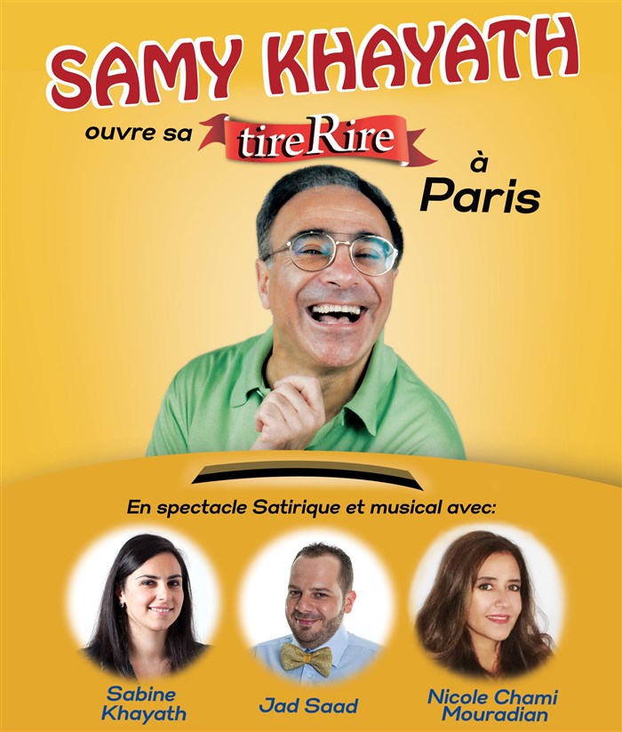 Samy Khayath, notre humoriste national libanais, viendra du Liban pour ouvrir sa " tire-Rire " dans la magnifique salle du théâtre Saint-Georges à Paris, en une seule et unique représentation, accompagné d'une partie de sa troupe composée de Sabine Khayath (sa fille), de Jad Saad (son fidèle compagnon depuis 10 ans) et de son fils Sami Junior (aux commandes de la régie-son).