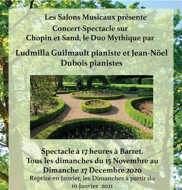 Le concert-spectacle dure environ 2 heures et est suivi d'un débat. Ce spectacle est agrémenté d'oeuvres musicales de Chopin de la période de 1839-1846 (Valldemossa à Nohant) interprétée au piano par Ludmilla Guilmault et Jean-Noël Dubois, pianistes concertistes, et par la lecture de lettres choisies entre Chopin et George Sand, sa vie mythique avec Sand.