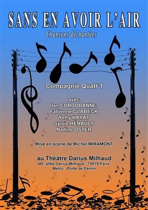 La Compagnie quatr'1, pour son troisième spectacle, vous présente une création à partir de textes de chansons, sans en avoir l'air. Vous connaissez la musique, vous connaissez les paroles, venez découvrir des chansons en tableaux, des chansons d'amour enchaînées, des chansons à l'air déconditionné. Venez découvrir des chansons " déchantées " qui suivent des chemins de traverse, l'air de rien.