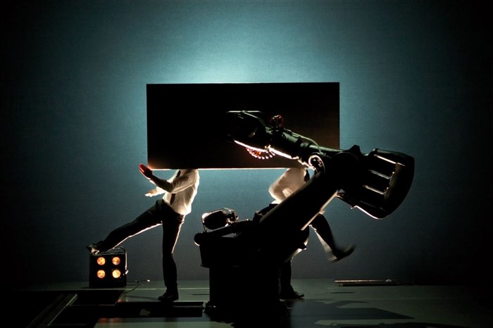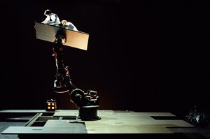 " Avec Sans objet j'ai voulu introduire sur scène un robot industriel ayant la force de déplacer des éléments de décor aussi bien que des acteurs. La machine devient un protagoniste à part entière.