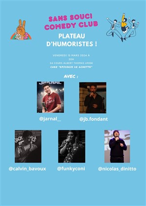 Sans Souci Comedy Club vous présente de nouveau un plateau d'humoristes - 5 artistes vont vous faire découvrir leur univers a travers des vannes et les histoires drôles :)