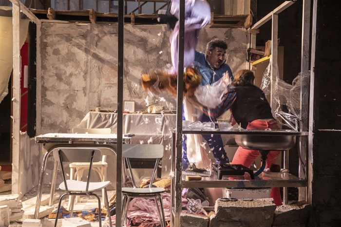 Le plateau est un chantier en déconstruction permanente, fait des strates du passé et des traces du présent. Le chant sort des ruines et les instruments de musique des décombres ; chaque musicien-interprète tente de reconstruire avec ce qu'il reste, de son souvenir déformé et de sa mémoire subjective.