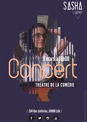 Après plusieurs concerts, Sasha Lypso, auteur compositeur dans le domaine de la variété et pop française de la métropole lilloise, livrera son répertoire sur les planches du théâtre de La Comédie de Lille le 9 Mars prochain. Toujours accompagnée par sa guitare, son amour de la scène vient principalement de son envie de partager des émotions avec le public.