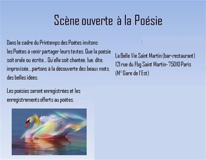 L’événement Scène ouverte à la poésie de type Lecture / Poésie / Contes, organisé ici :