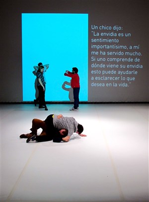 Dans le laboratoire de la jeune compagnie espagnole fondée en 2010, la question est également posée sur le plan formel. Comme dans un castelet, leur théâtre est action, il associe trois mécanismes : alternance entre narration et projection (de texte), décalage entre texte et mouvement (ils sont jeunes et dansent souvent), omniprésence de la musique électronique (qui agit comme une sous-tension). Il est bien question, on le voit, de se mettre en scène dans le théâtre de la vie, petits hommes au creux de la société. À taille réelle, nous les regardons et nous sommes eux.