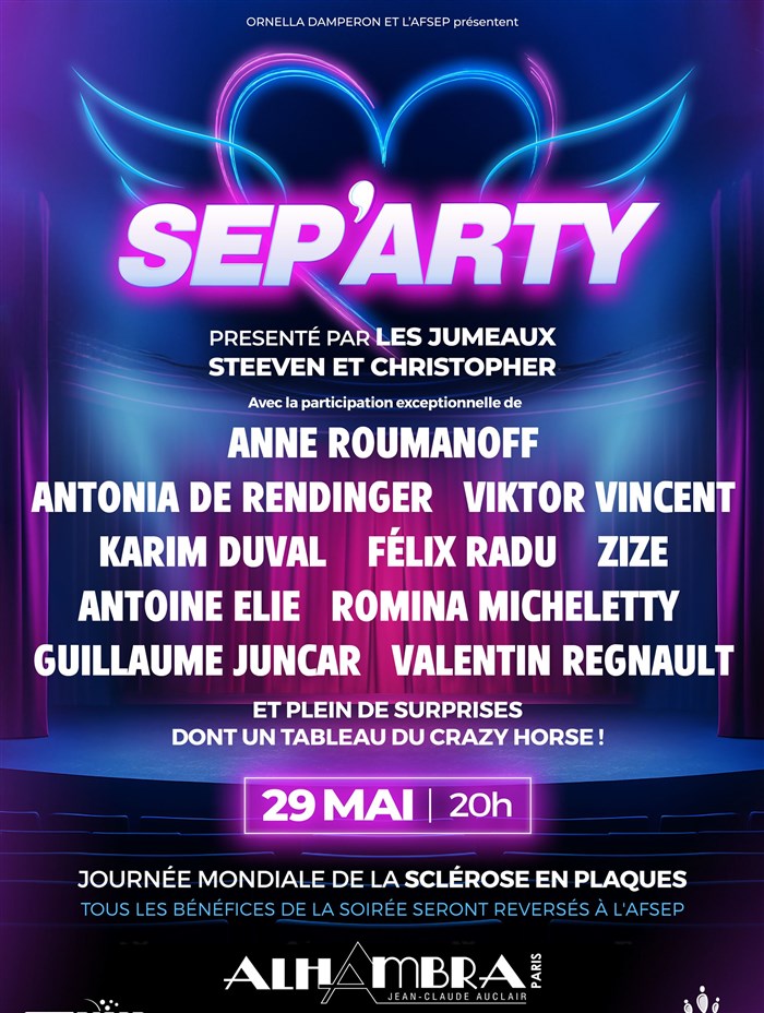 Le Mercredi 29 Mai 2024 à 20H00 au Théâtre de l'Alhambra, à l'occasion de la journée mondiale de la Sclérose en Plaques aura lieu la Sep'Arty.