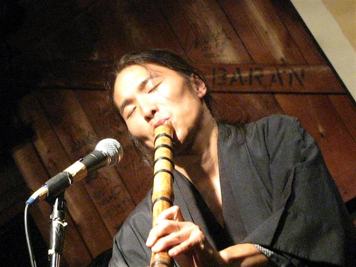 Les sons purs et longs qu'il tire de son "shakuhachi" (flûte en bambou japonaise), instrument zen par excellence, transforment ses performances en expériences particulièrement méditatives. Sur ses épures traditionnelles, un calligraphe viendra cette fois calquer ses improvisations graphiques.