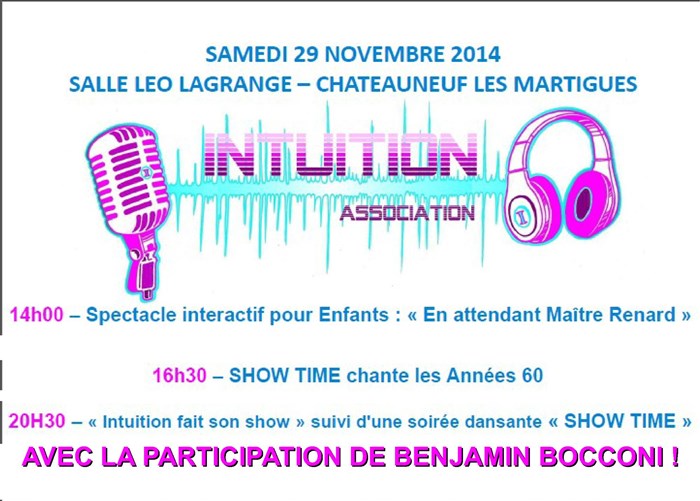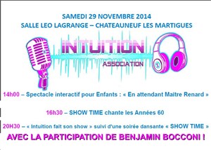 - 20h30 : "Intuition fait son show" suivi d'une soirée dansante avec "Show Time" avec la participation de Benjamin Bocconi (the voice, adam et eve ...)