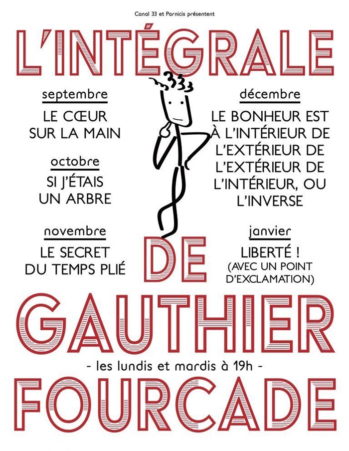 Je ne vais pas souvent voir d'humoriste. Pour l'anniversaire de ma mère, et suite à quelques échos élogieux j'ai tenté ma chance. Le spectacle, tout en finesse, est incroyable de poésie. L'humour repose sur le maniement des mots qui détournés de leur sens, permettent à l'auteur une démonstration sur la question du temps. Comment s'écoule t'il ? Pourquoi ne fait il qu'avancer ? On y rit, non de façon grasse, mais de bon coeur devant un univers original qui à son tour, nous questionne. Bref, je recommande ! D'autant plus qu'à la séance ou je suis allé, nous étions très peu dans la salle ce qui n'a pas perturbé Gauthier Fourcade très bon en tant qu'acteur. Pour se faire une idée de son univers, quelques vidéos trainent par ci par là sur la toile. Allez y d'urgence !