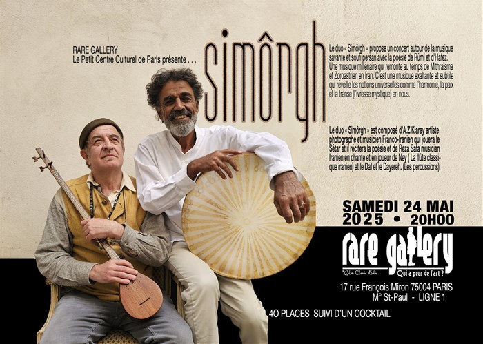 Le duo "Simôrgh" est composé d'A.Z.Kiaray artiste photographe et musicien Franco-Iranien qui jouera le Sêtar et il récitera la poésie et de Reza Safa musicien Iranien en chante et en joueur de Ney ( La flûte classique iranien) et le Daf et le Dayereh. (Les percussions)..