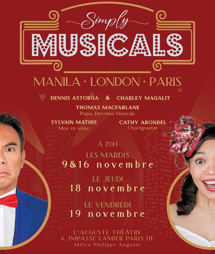 Cette année, le spectacle a été remanié et reimaginé en "Simply Musicals", Manila - London - Paris, fois-ci en partenariat avec l'association Pinoy Jam Paris. Dennis Astorga, baryton martin, et Charley Magalit, soprano, offriront une nuit de rires et de nostalgie, en partageant des histoires tirées de la vie ordinaire rendues extraordinaires par la musique. Ce duo dynamique nous fera entendre une variété de chansons tirées de comédies musicales de l'âge d'or que nous connaissons et aimons tous, de comédies musicales modernes jouées sur les scènes de Broadway, du West End, de Paris et de Manille. Mettant en vedette des talents philippins de renommée internationale, ainsi que le pianiste et directeur musicale Thomas Macfarlane, ce spectacle sera sans nul doute une soirée inoubliable.