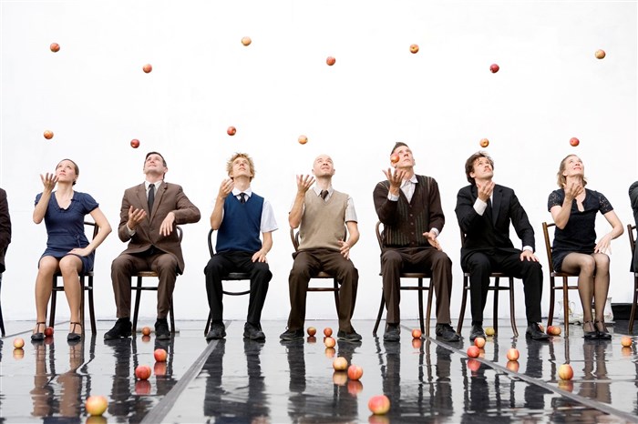 Sur scène, neuf chaises alignées, une centaine de pommes au sol et neufs jongleurs, sept hommes, deux femmes font leur entrée pour un hommage rieur à la chorégraphe allemande Pina Bausch.