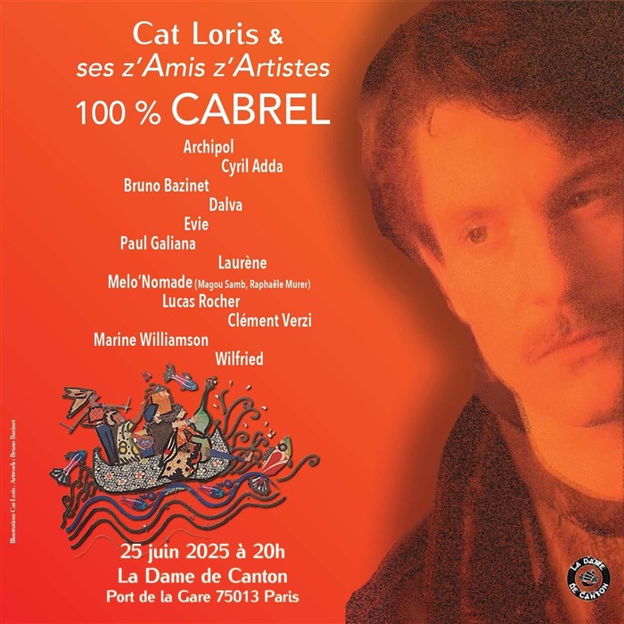 Cat Loris a découvert Cabrel quand elle avait 8ans, elle est tombée grâce à lui dans la marmite de la création. Le 25 juin elle rassemblera autour d'elle des Zamis Zartistes, et vous tous et toutes qui serez la, pour le plaisir de se rouler tous/tes ensemble dans les chansons de Cabrel. Venez nombreux pour bien ancrer La Dame de Canton à son Quai de la gare : le bateau risque de décoller si tous les c(h)oeurs à l'unisson résonnent sous la voûte étoilée parisienne !)