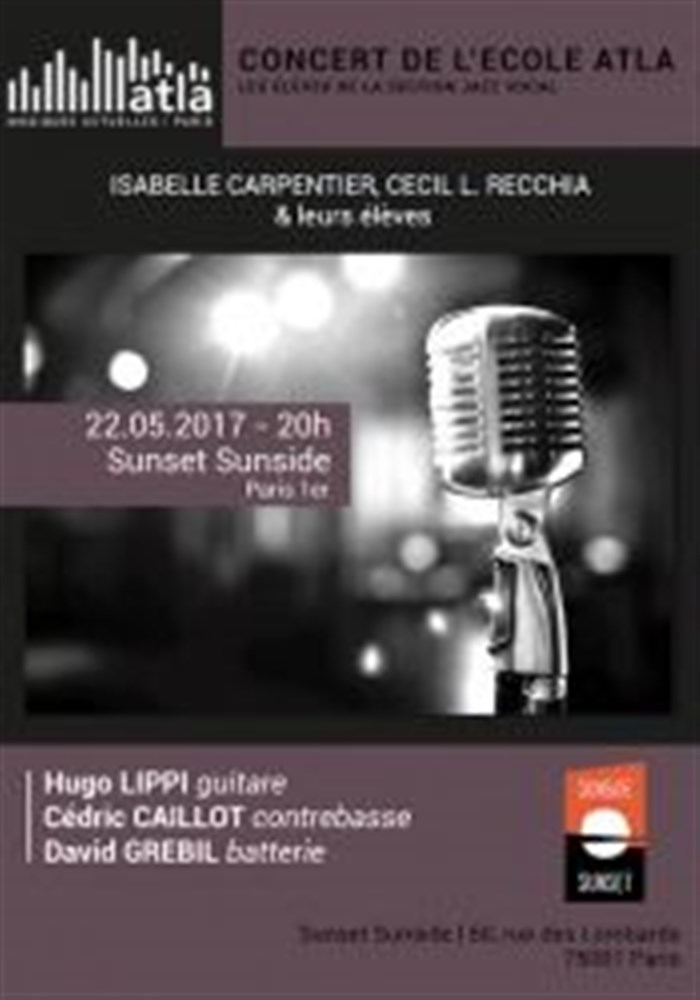 L'Ecole des musiques actuelles ATLA, vous propose de venir découvrir le travail de ses étudiants en jazz vocal. Retrouvez sur la scène du Sunset les élèves des classes de jazz vocal de Cecil L. Recchia et Isabelle Carpentier. Pour l'occasion, ils seront accompagnés par Hugo Lippi (guitare), Cédric Caillaud (c.basse) et David Grebil (batterie). Le jazz vocal de demain!