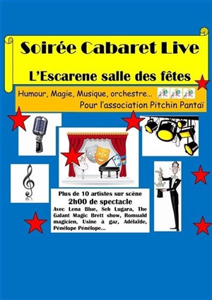 Soirée cabaret live avec plus de 10 artistes sur scène, plus de 2h00 de spectacle, humour, magie, chanteurs et musique se rencontrent sur une même scène pour la même soirée. Spectacle unique. Vous êtes certain de passer une bonne soirée, riche et variée, soirée ouverte à tout public, même les enfants ne pourront pas s'ennuyer.