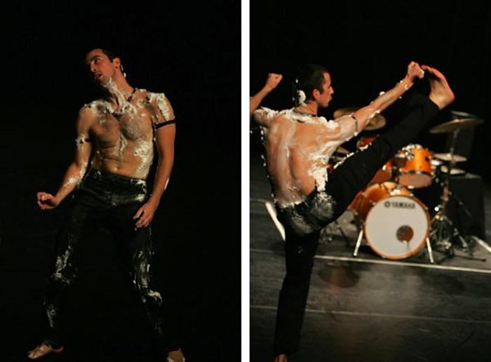 une rencontre, un duo entre un batteur et un danseur, un instrument ou plutôt un ensemble d'instruments, de musique ou de cuisine, une série de mouvements où les jambes battent, ce qu'on recharge ou ce qui est à plat.