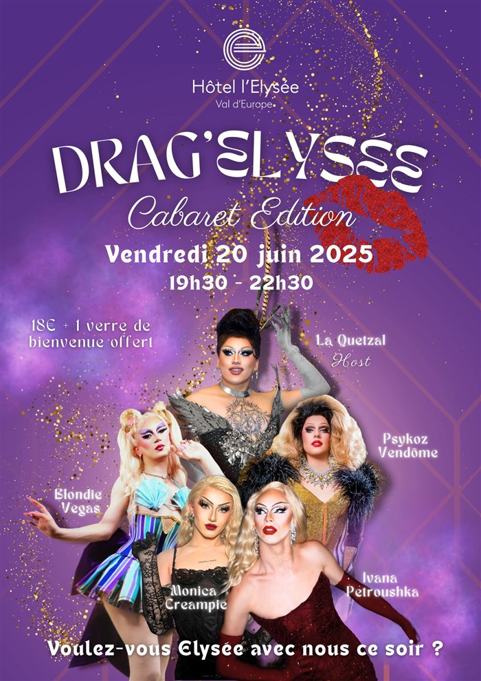 Après le succès retentissant de notre première édition, le Drag'Elysée de l'Hôtel l'Élysée Val d'Europe revient, plus flamboyant que jamais, pour une soirée 100% cabaret ! Préparez-vous à vivre une explosion de paillettes, de plumes, de voix puissantes et de performances spectaculaires... le tout dans une ambiance chic, décalée et résolument festive !