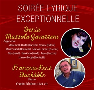 Soirée lyrique avec la soprano Denia Mazzola Gavazzeni et le pianiste François-René Duchâble; oeuvres classiques et opéras italiens.
