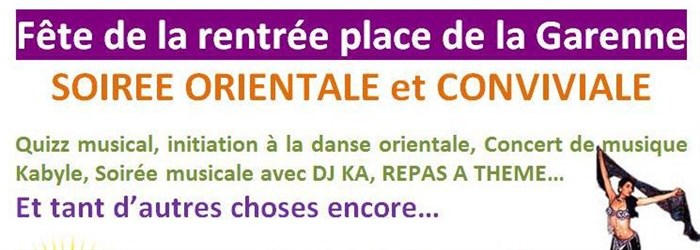 19h30 Concert et exhibition de danses orientales Le groupe Kabyle Amagran et la danseuse Bouchara vous feront danser sur la Place de la Garenne...