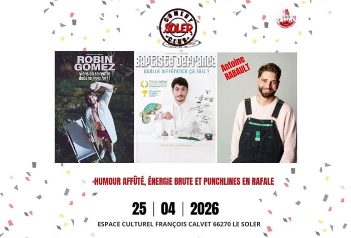 Découvre Soler Comedy Club, qui fait partie de notre sélection d’événements de type Humour et qui se tient ici : Salle François Calvet - Le Soler.
