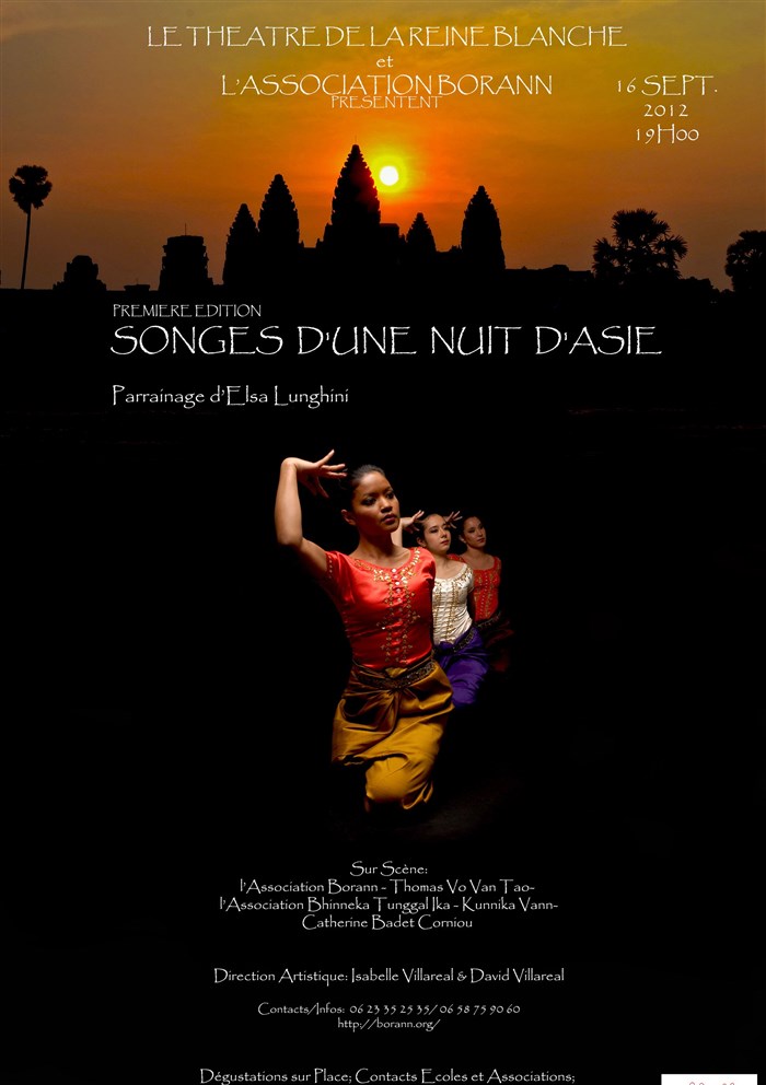 A l'occasion des 20 ans de Borann, nous vous invitons à découvrir cette première édition de Songes d'une Nuit d'Asie, et ainsi, à vous laisser transporter, par la grâce et la beauté des Divinités de l'Asie du Sud-est, représentées par nos danseuses Cambodgiennes, de l'association Borann, mais également, Indonésiennes de l'association Bhinneka Tinggal Ika, Thomas Vo Van Tao notre Danseur Indien, ainsi que Kunnika Vann et Catherine Badet Corniou, qui vous feront découvrir la vie des Cambodgiens, la Culture, la Coutume et la philosophie Khmère au travers de contes et recits, sous le Parrainage de l'Actrice et Chanteuse Elsa Lunghini.