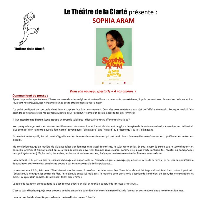L’événement Sophia Aram | Nouveau spectacle de type One Woman Show, organisé ici : Théâtre de la Clarté -