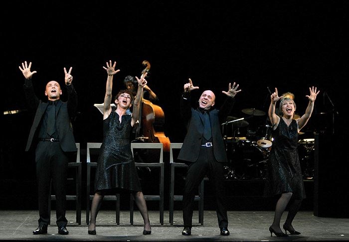 Car du verbe français et de la musique jazzy, il y en aura au travers des vingt-cinq chansons interprétées par quatre comédiens-chanteurs, mis en jambe par Laurent Pelly. On retrouvera les facéties de CharlesTrénet et Johnny Hess (Sous le lit de Lily ; Je suis swing), le délicieux Clopin-clopant de Bruno Coquatrix, les perles de Serge Gainsbourg, Claude Nougaro (Danser sur moi), Salvador, Charles Aznavour (Oublie Loulou, Pour faire une jam) ou Boris Vian (J'coûte cher)...