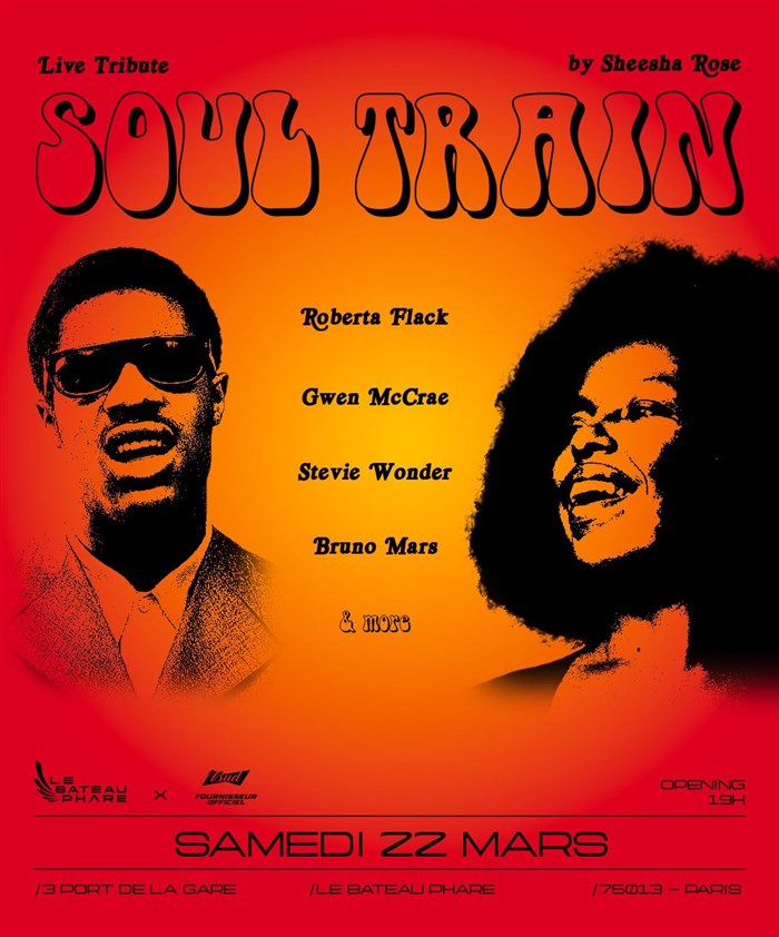 Laissez-vous emporter par une soirée magique où les légendes de la soul, du funk et du R&B prennent vie sur scène ! Sheesha Rose, un groupe talentueux aux influences puissantes et vibrantes, vous invite à revivre l'essence même du Soul Train avec des performances exceptionnelles en hommage à des icônes comme Roberta Flack, Stevie Wonder, Gwen McCrae, Bruno Mars et bien d'autres encore !