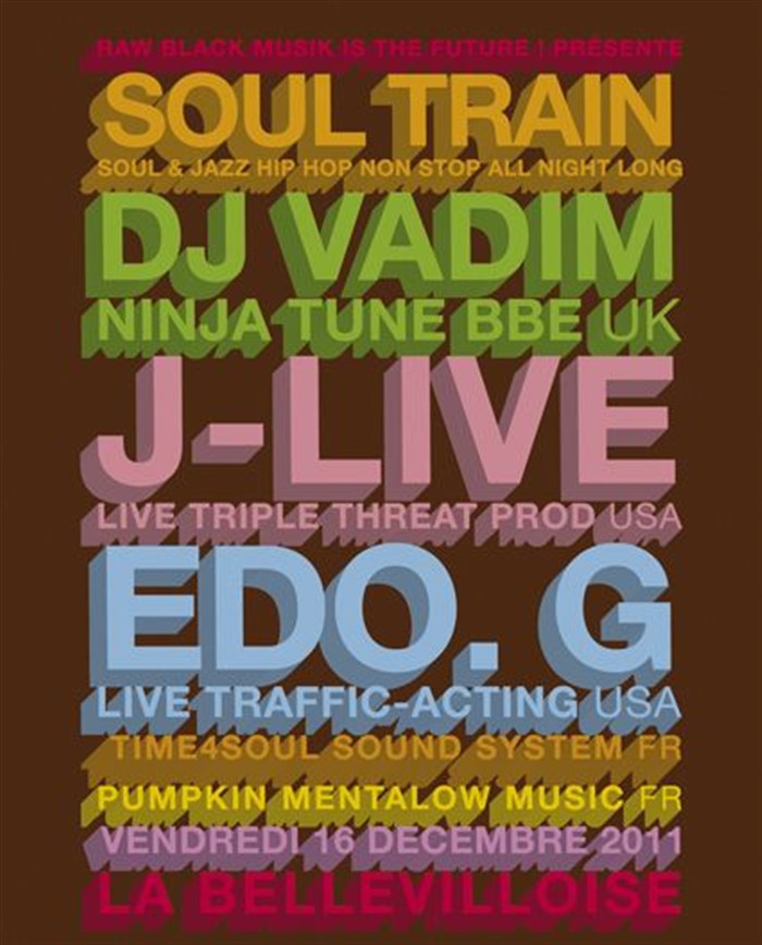 L’événement Soul train avec avec J-Live et Edo.g + Dj Vadim de type plateau d'artistes, organisé ici :