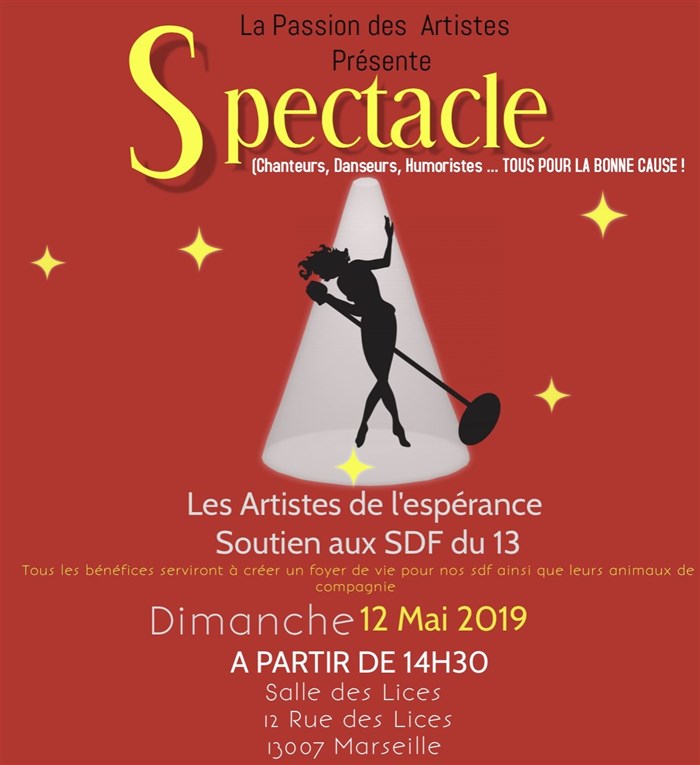 3h de spectacle avec différents artistes qui se produiront bénévolement pour la bonne cause, venir en aide aux "Sans Abris" du département 13.