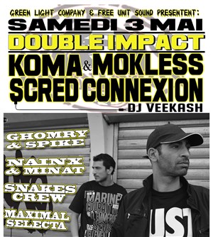 L’événement Spectacle Hip hop : Double Impact #2 - Koma & Mokless (La Scred Connexion) de type Urbain (Rap et hip-hop..), organisé ici :