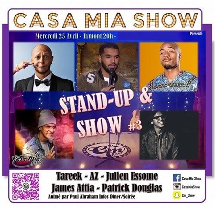 Casa Mia Show, nouvelle scène et ComedyClub à Ermont, Val D'oise, vous présente cette soirée exceptionnelle avec Julien Essome, Franjo, Pierre Thevenoux humoristes du JCC, Beni Chanteur de la Nouvelle Star... et le magicien Aymeric Romet!
