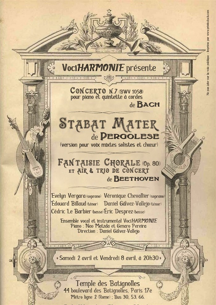 - Stabat Mater de G. B. Pergolèse (version quatre solistes et choeur mixtes) avec instrumentation d'origine, quintette à cordes et continuo avec orgue