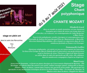 Ce stage Chant polyphonique Chante mozart du 5 au 7 août 2021 Avec Elizabeth Grard / une chanteuse lyonnaise qui a choisi de suivre son temps dans ses recherches, ses richesses, ses contemporains de Cathy Berberian à Marc Favre.