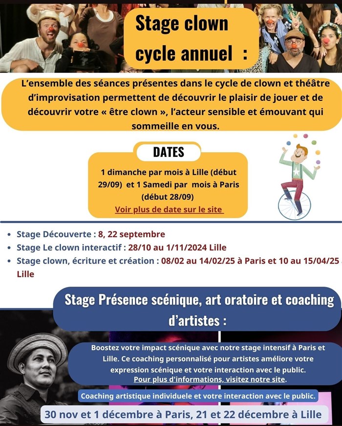 - Stage Intensif Clown 1 "Le clown interactif, authentique et vulnérable" : 28 oct au 1er nov 2024 à Lille
