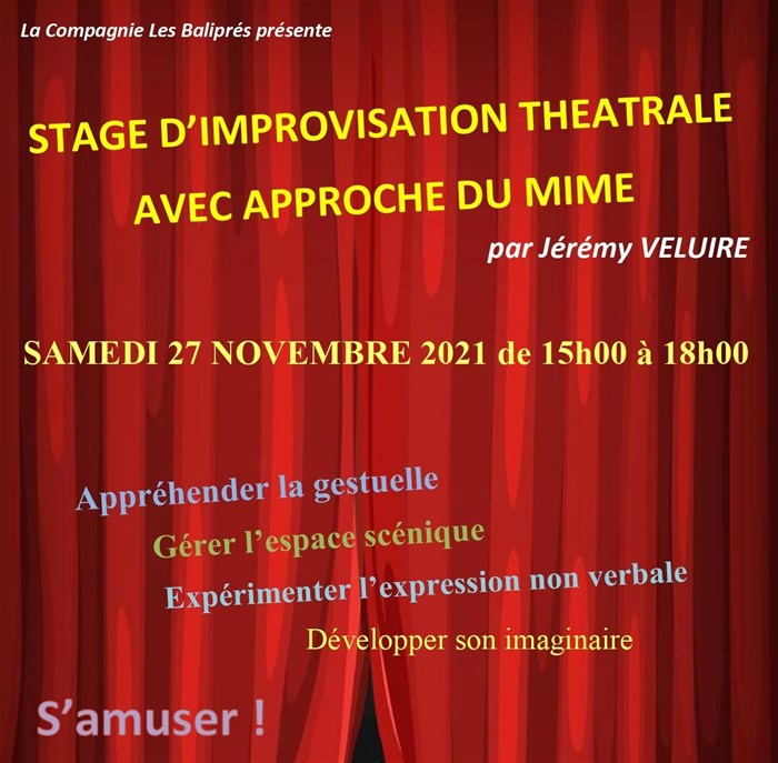 L’événement Stage d'improvisation théâtrale avec approche du mime de type Cours Danse, Théâtre, Clown, Chant, organisé ici :
