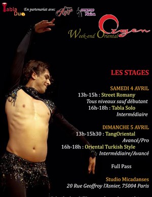 Wow Drum solo - samedi 4 avril de 16h à 18h - niveau intermédiaire : Si vous aimez le tabla solo et que vous voulez impressionner votre public avec une danse puissante, c'est un excellent stage pour apprendre notamment des mouvements de hanches et ajouter une touche jazz avec les mouvements de mains et de bras proposés par Ozgen : Démarquez votre style !